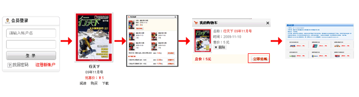 注冊(cè)/登錄->購 買->購買選擇->放入購物車->立即結(jié)賬->選擇支付方式付款