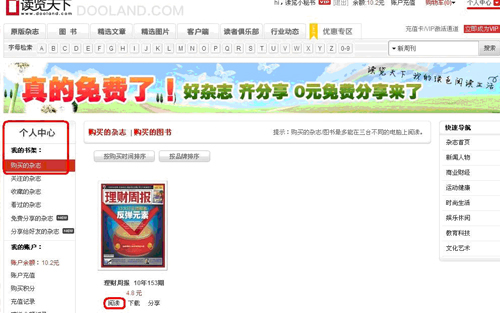三、 進(jìn)入“個(gè)人中心-購買的雜志”里,點(diǎn)擊“閱讀”